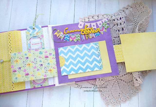 С правой стороны у нас насыщенная страничка с карманом, на котором разместилась рамка - веночек для большого семейного фото.